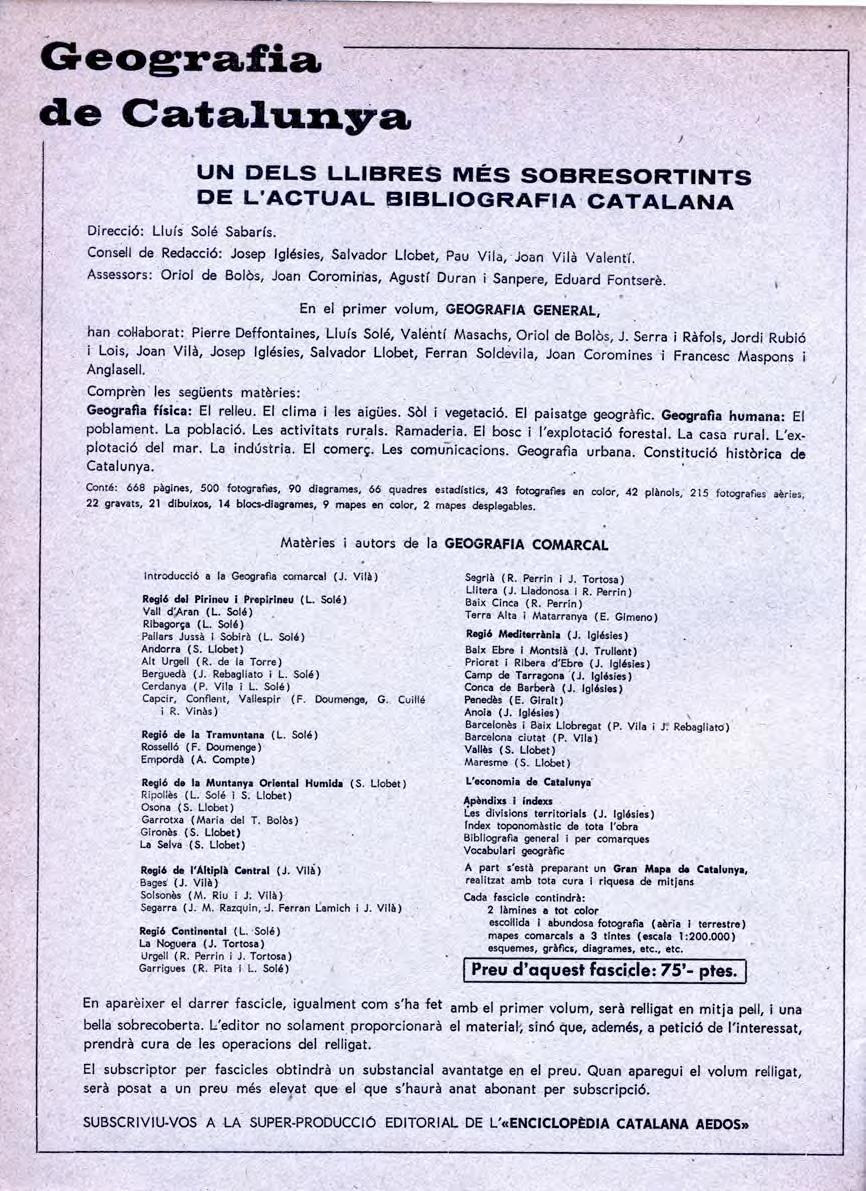 CONFERENCES. FIFTIETH ANNIVERSARY OF THE PUBLICATION OF THE FIRST VOLUME OF GEOGRAFIA DE CATALUNYA (AEDOS)