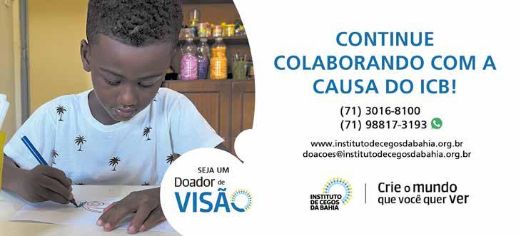Um olhar de esperança para um mundo que fortaleça a dignidade de cada pessoa com deficiência visual. É a nossa meta. Trabalhamos, por isso, todos os dias no Instituto de Cegos da Bahia, com uma equipe capacitada, humana e à disposição para oferecer o melhor atendimento nas áreas da saúde, educação (ratificando nosso compromisso com a criança e o adolescente) e assistência social. Obrigada por abraçar a nossa causa e participar do Programa Doador de Visão!