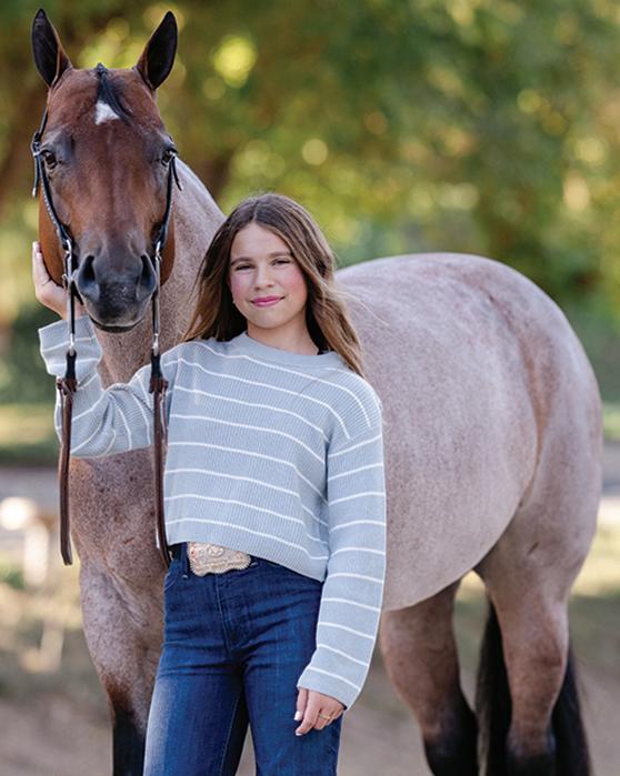 Hailey Brown is pictured on the opposite page with Cool Cruzen Lady. Across the top (left to right) Hailey with ?; and with Cool Cruzen Lady at the 2024 Quarter Horse Congress. On this page Hailry is pictured (top) with Cool Cruzen Lady at the AQHA Youth World Show and enjoying the great outdoors.