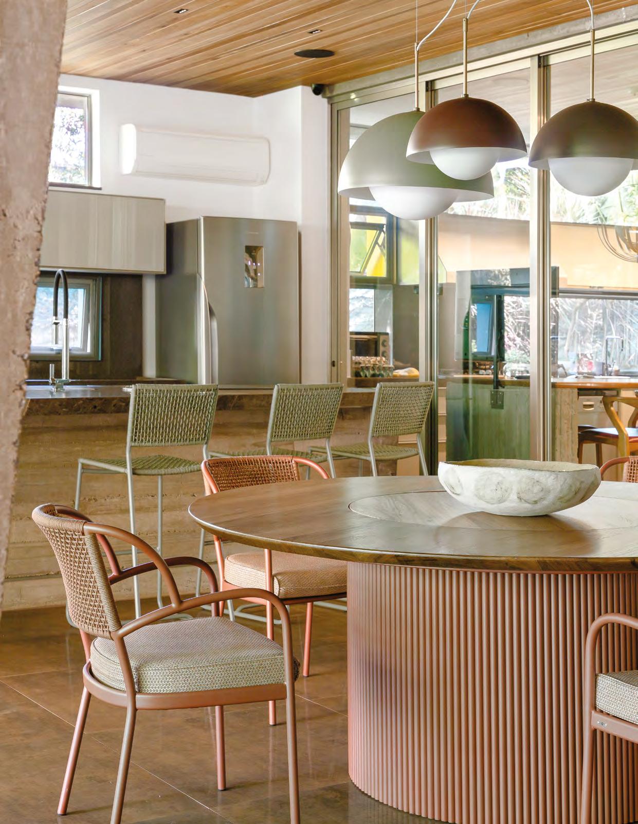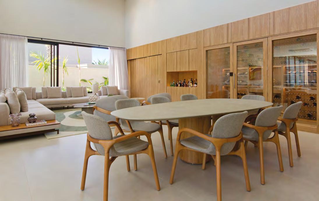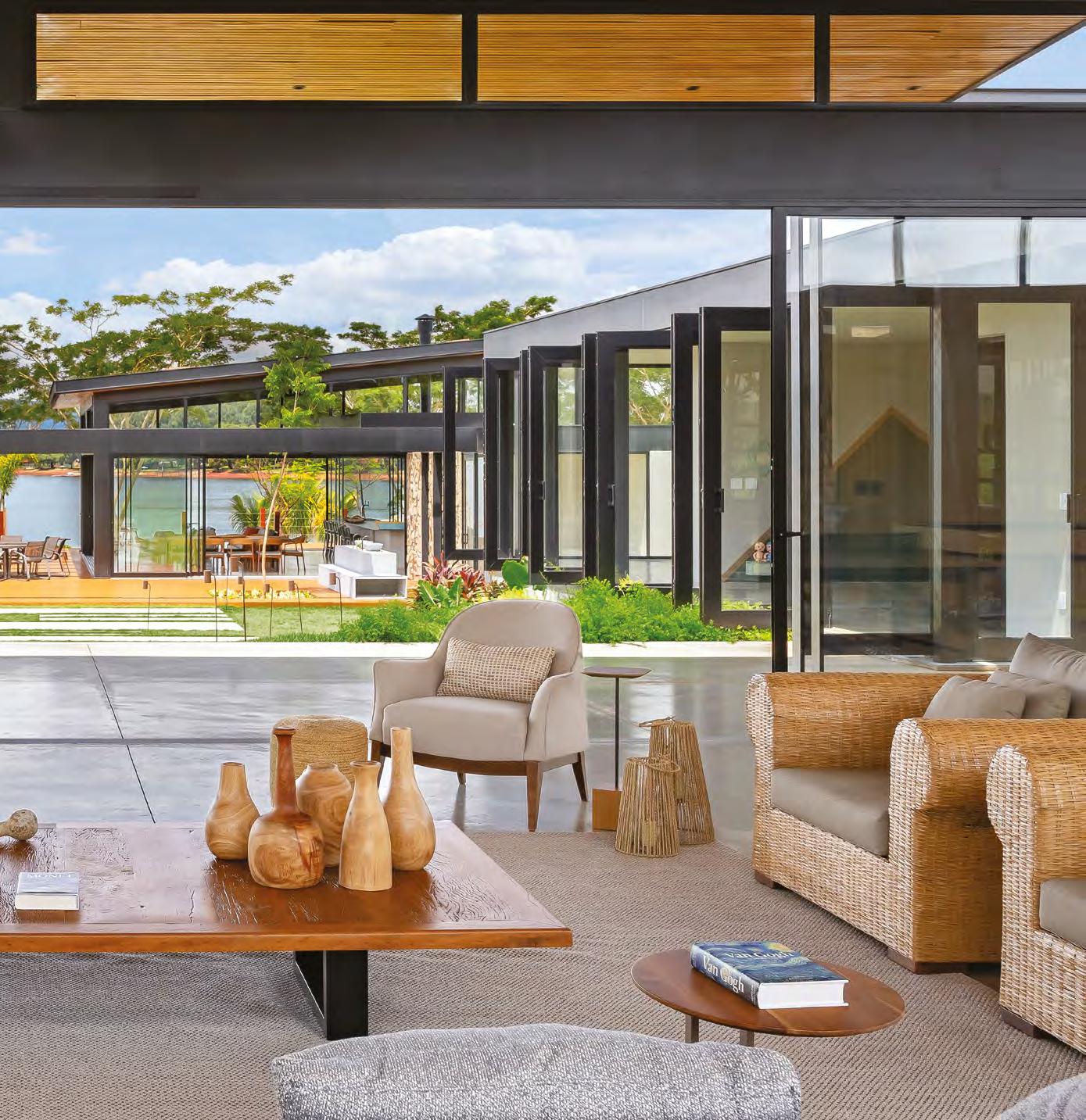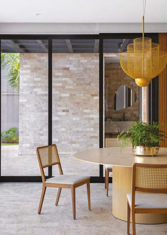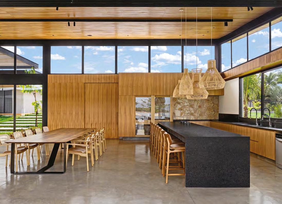 Acima, a integração entre a sala e a área gourmet, em um espaço que une com sofisticação diferentes materiais, como a madeira dos móveis sob medida e painéis (Classe A Móveis), o granito São Gabriel Escovado das bancadas e o piso em cimento queimado. A mesa de jantar (Copav) tem design contemporâneo, assim como as cadeiras e as banquetas do gourmet, ambas da Tend Tudo Decor. A iluminação inclui pendentes (Luminá) em palhinha, combinando com a natureza que ganha a cena a partir das esquadrias (Espadari Esquadrias). Ao lado, o lavabo com bancada em madeira natural (Design da Tora), cuba esculpida em pedra e, para complementar acessórios decorativos (Tend Tudo Decor). Na página seguinte, destaque para o decór do ambiente que se integra ao paisagismo a partir das esquadrias em alumínio (Espadari Esquadrias). Os objetos de decoração são da Tend Tudo Decor