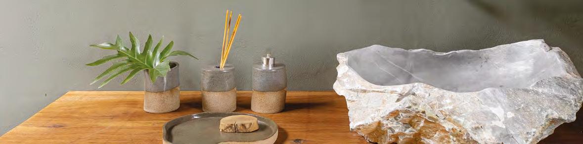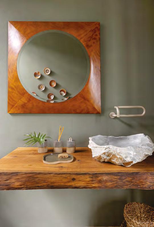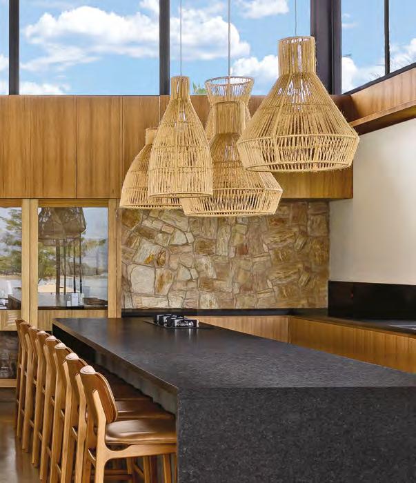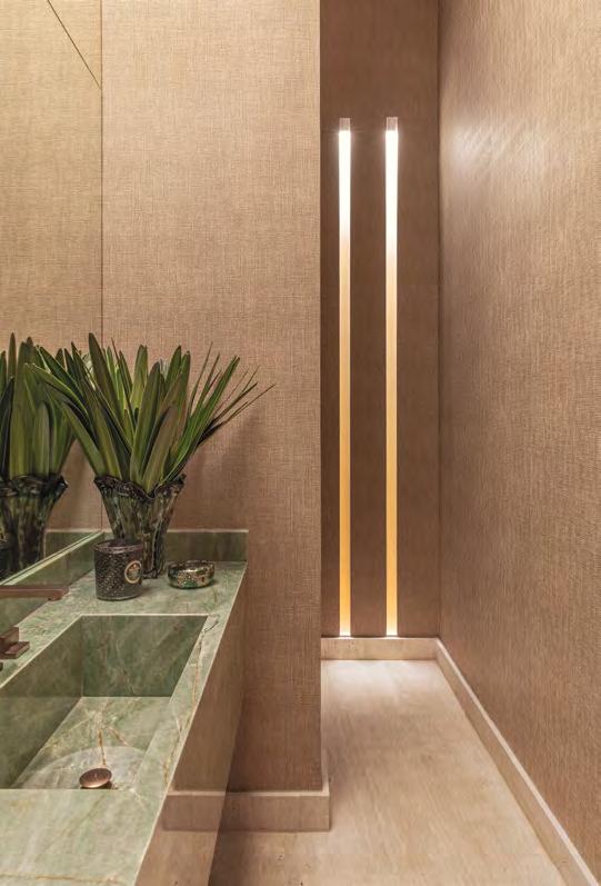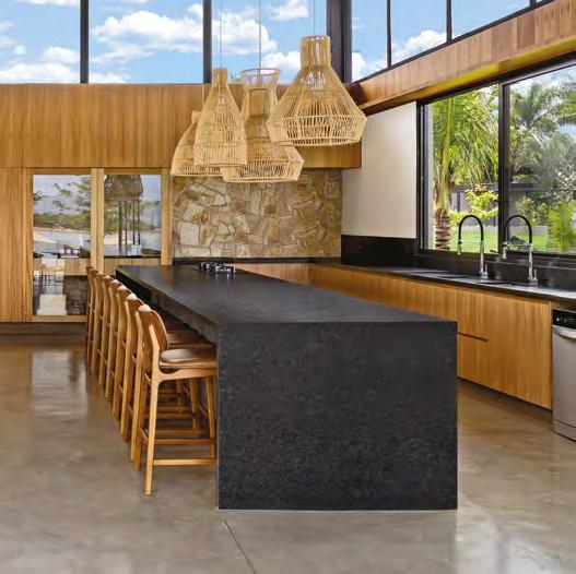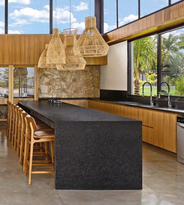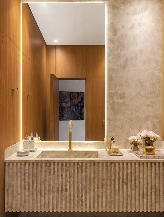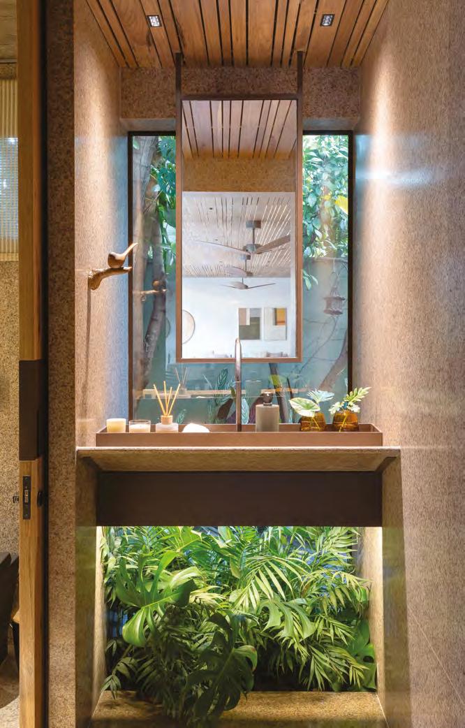 Acima, a integração entre a sala e a área gourmet, em um espaço que une com sofisticação diferentes materiais, como a madeira dos móveis sob medida e painéis (Classe A Móveis), o granito São Gabriel Escovado das bancadas e o piso em cimento queimado. A mesa de jantar (Copav) tem design contemporâneo, assim como as cadeiras e as banquetas do gourmet, ambas da Tend Tudo Decor. A iluminação inclui pendentes (Luminá) em palhinha, combinando com a natureza que ganha a cena a partir das esquadrias (Espadari Esquadrias). Ao lado, o lavabo com bancada em madeira natural (Design da Tora), cuba esculpida em pedra e, para complementar acessórios decorativos (Tend Tudo Decor). Na página seguinte, destaque para o decór do ambiente que se integra ao paisagismo a partir das esquadrias em alumínio (Espadari Esquadrias). Os objetos de decoração são da Tend Tudo Decor