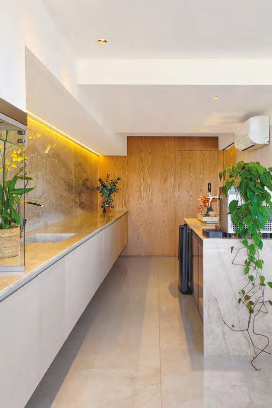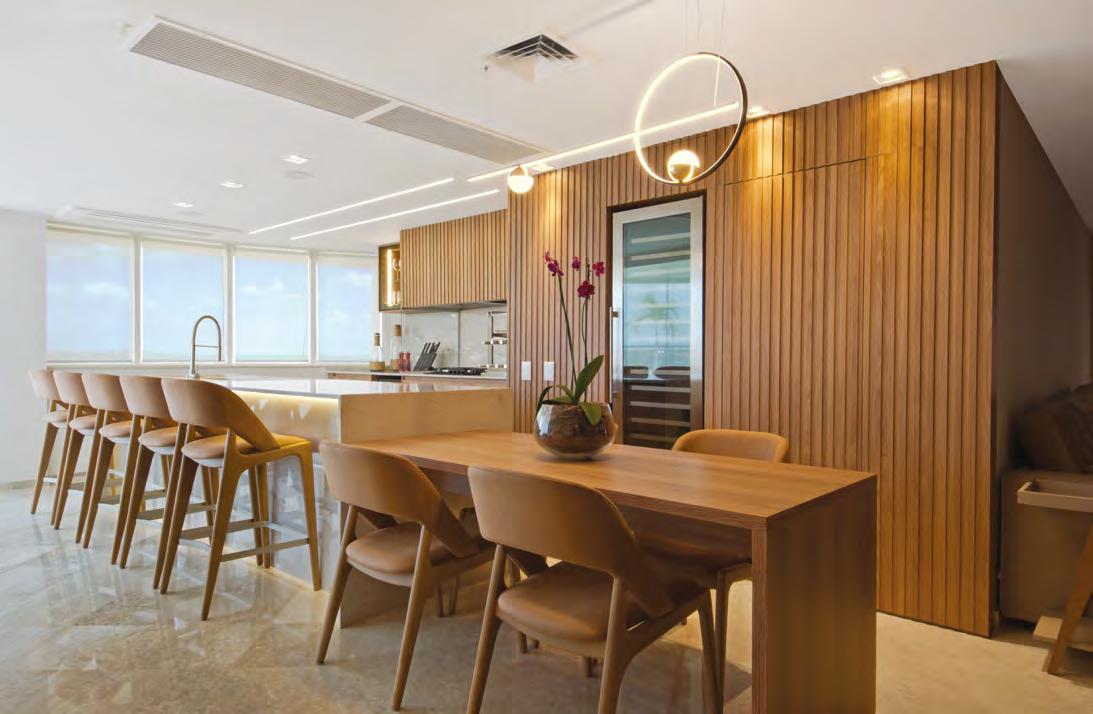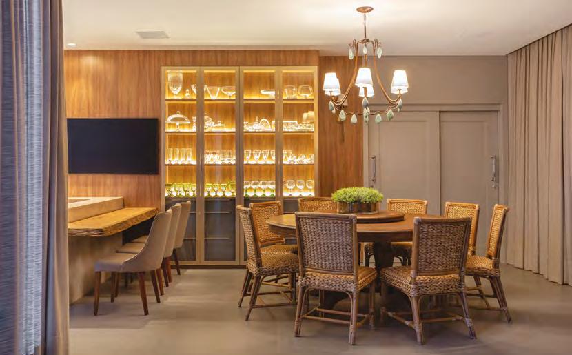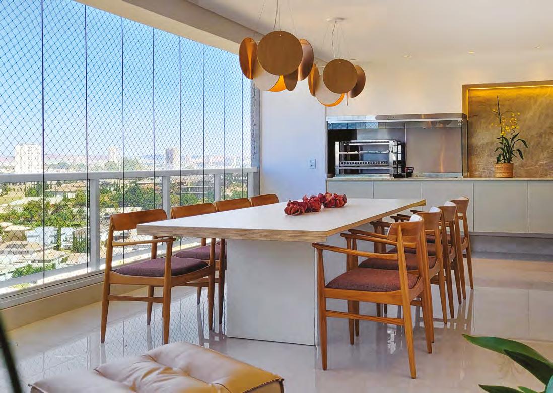 À esquerda e abaixo, a varanda gourmet foi unificada ao living com a retirada de portas e paredes. O piso em porcelanato da Portobello Shop Ribeirão Preto no formato de lastra harmoniza-se com os balcões do gourmet em Quartzito Taj Mahal. A mesa de jantar Paulista, desenhada por Paulo Alves, é acompanhada de cadeiras em madeira Teca do designer Fernando Jaeger e iluminada por pendentes de madeira de Cris Bertolucci. Os móveis sob medida da Creare Marcenaria otimizam o espaço disponível, com balcões na cor areia e painéis em Carvalho Americano. O espaço gourmet inclui churrasqueira, coifa, copeira, balcão refrigerado e adega, tudo da Máxima Gourmet