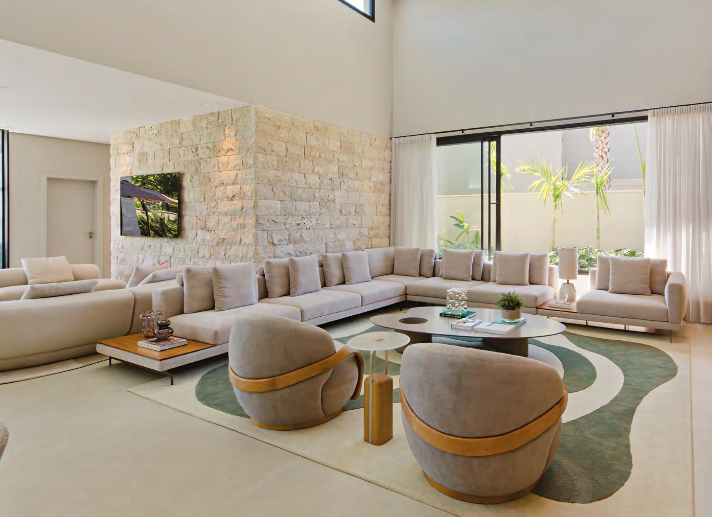 Nesta, a sala de convívio com aberturas (Espadari Esquadrias) que conectam com o espaço externo, oferecendo vistas panorâmicas para o jardim. O ambiente, com um design minimalista, proporciona uma atmosfera acolhedora e convidativa para interações. Os tapetes de fibras naturais e as decorações são da Tend Tudo Decor
