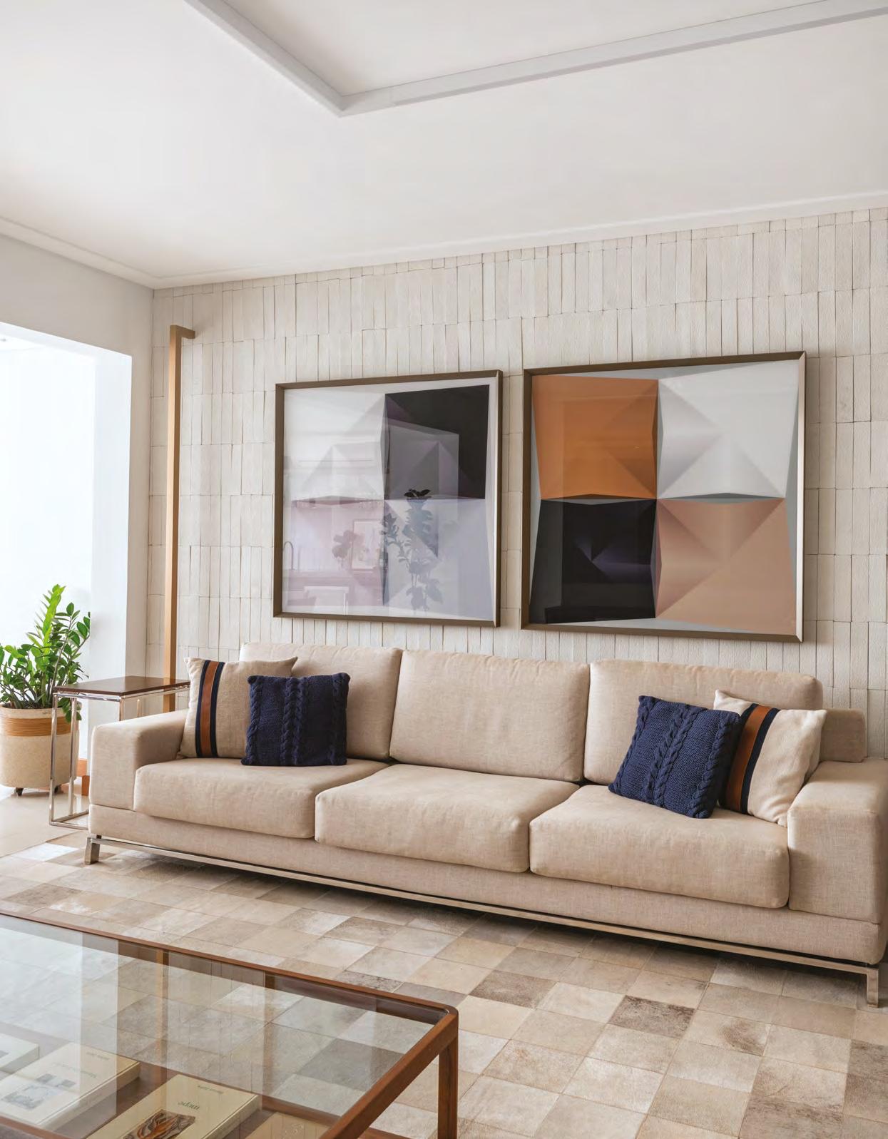Nesta, o living com móveis contemporâneos complementados pelas decorações e quadros em tons sóbrios. O revestimento brick cimentício da Gauss na parede finaliza o ambiente, que é integrado à varanda. Na página anterior, o hall do elevador foi personalizado com paredes em azul escuro, banco, quadro e arandelas com luz quente