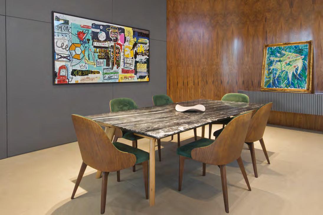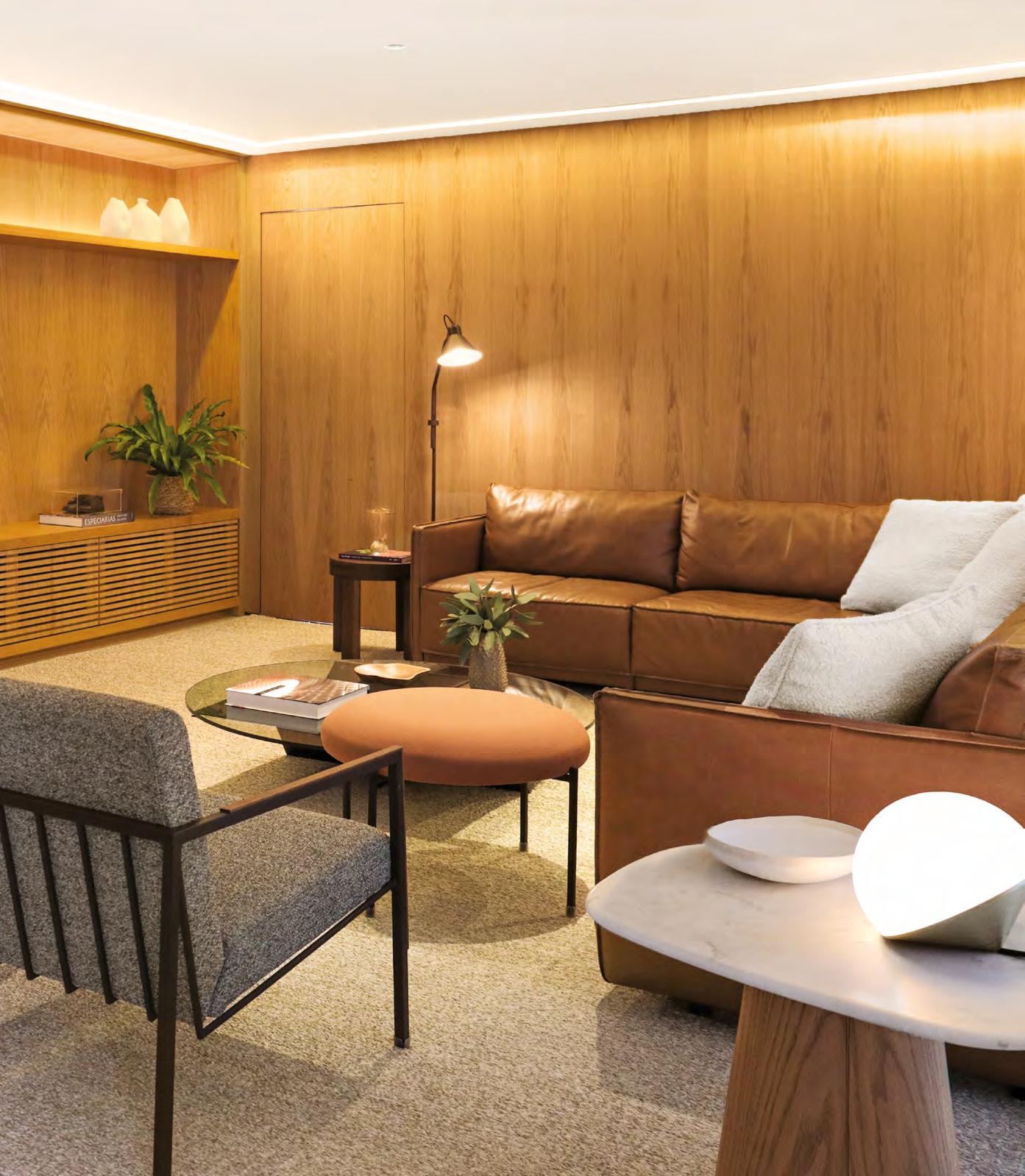 Acima, o jantar, tem móveis contemporâneos, uma obra de arte (Quadros Suzana Guimarães) e uma escultura vermelha na mesa que garantem toda a cor necessária ao espaço. No piso, foi utilizado o porcelanato em lastra da Portobello Shop Ribeirão Preto. Ao lado, no living, os tons terrosos predominam, criando um ambiente aconchegante, destacado pelo sofá em “L” de couro e pela marcenaria (Creare Marcenaria) em madeira Carvalho Americano, que se estende do home até os painéis que revestem as paredes e ocultam portas. O tapete, feito em tear, forma a base para o mobiliário, que inclui poltronas e uma mesa de centro assinada por Rodrigo Ohtake