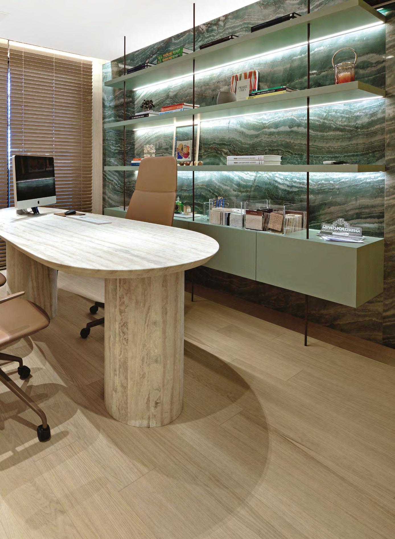 A BRICH, referência em execução de projetos sofisticados, destaca esta mesa de formato orgânico em Travertino Romano Bruto Levigado, com design da arquiteta Camila Strang. O painel da estante, feito em Quartzito Emerald Green, compõe o incrível projeto deste escritório. Elementos naturais, como pedra e madeira, estão muito presentes na proposta.