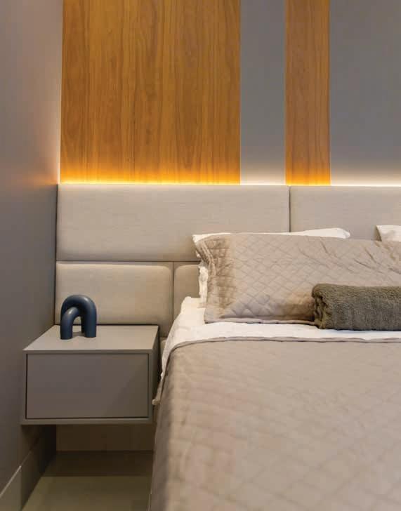 Nos quartos, a atmosfera tranquila é marcada pela paleta suave, com móveis em madeira clara (Graza Ambientes Planejados) e enxoval em tecido leve. A cabeceira estofada reforça o conforto do ambiente. A iluminação embutida (Lupz Iluminação e Automação) cria cenas acolhedoras nos ambientes. No lavabo, a bancada com cuba esculpida, espelho iluminado e metais em acabamento fosco expressam sofisticação discreta
