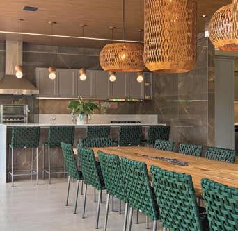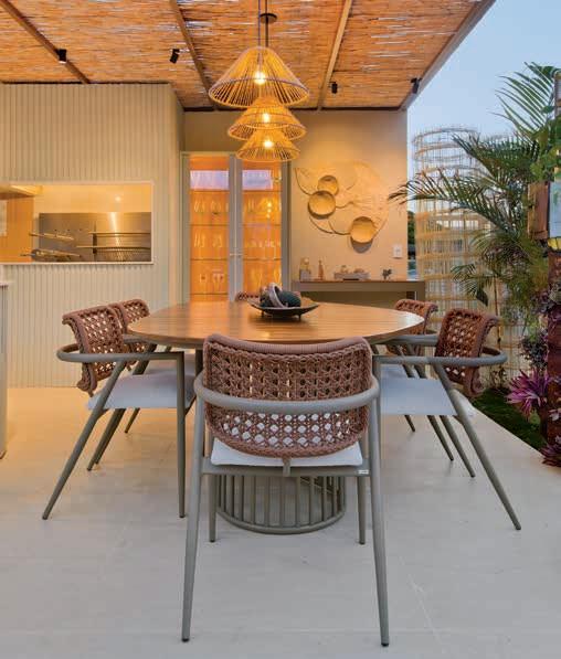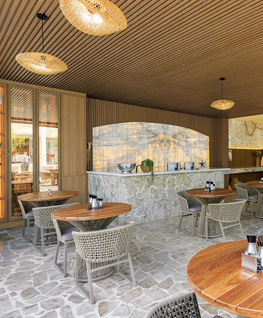 Nesta, o restaurante foi decorado com artesanato local para valorizar a cultura da região e garantir identidade única. O teto tem padrão amadeirado, assim como os móveis sob medida. A iluminação quente e pontual criou uma atmosfera acolhedora. No piso e paredes, o destaque é a pedra natural (Mont Pedra). As mesas e cadeiras em madeira maciça e alumínio com corda náutica, assim como os móveis da área externa, completam o ambiente com conforto