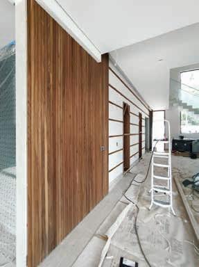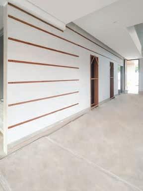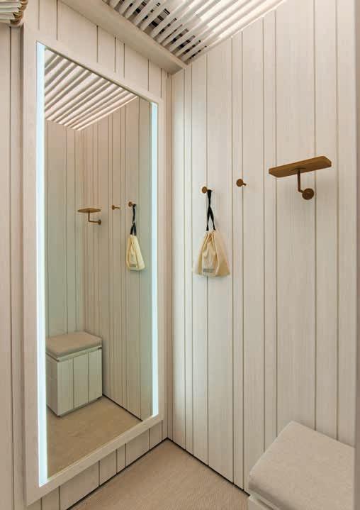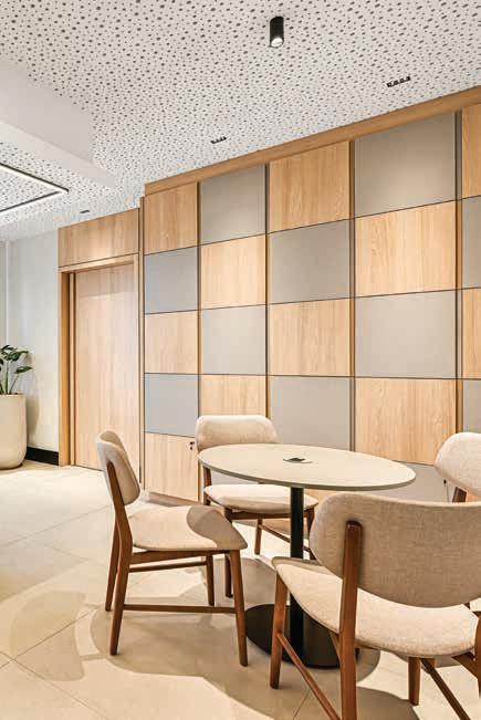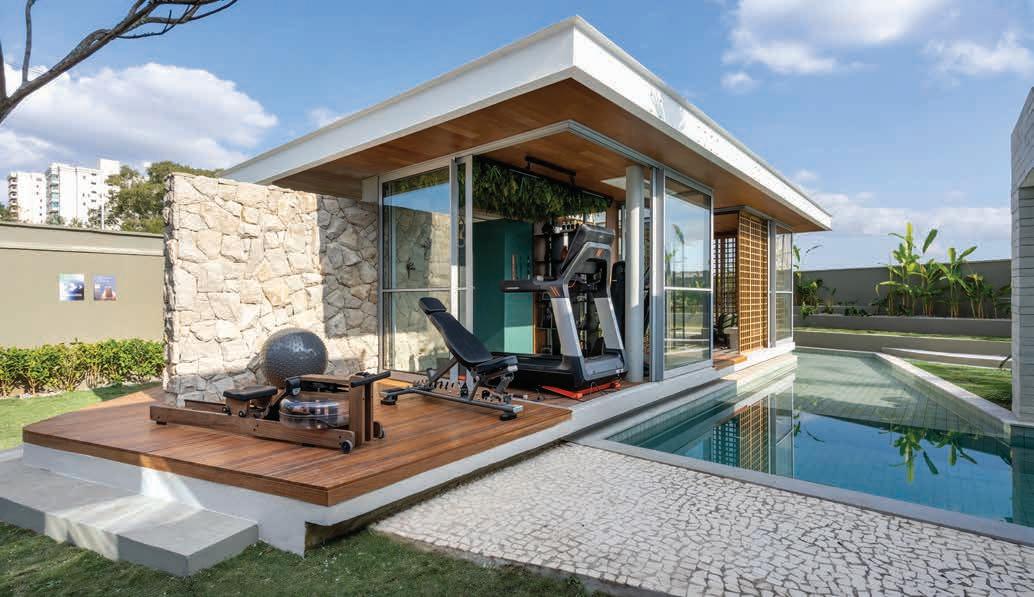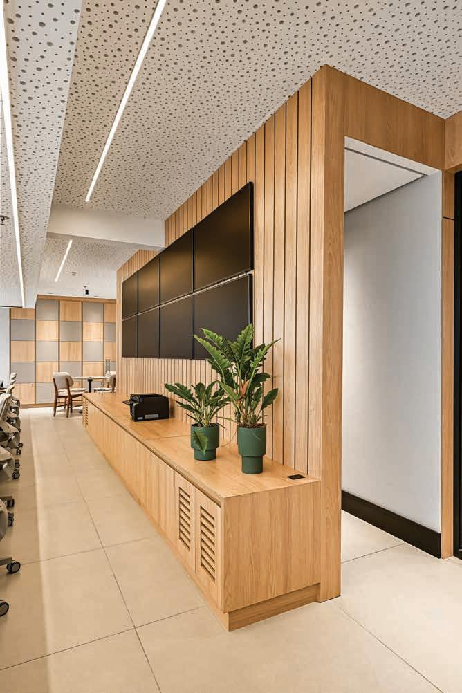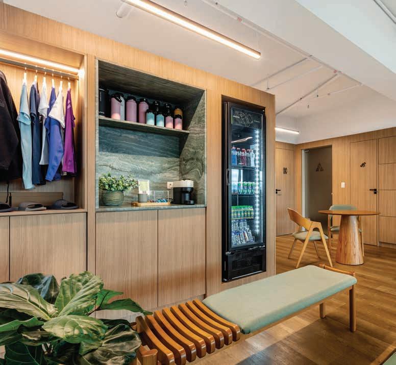 Nesta, a recepção e o espaço de convivência, com painéis e móveis sob medida em madeira clara (Lumax Movelaria) com nicho em quartzito Maestro Green escovado (Dorym Marmoraria), piso vinílico em madeira compatibilizada (Ekológika) e móveis soltos da CF Home Design. A iluminação garante funcionalidade para os treinos, enquanto a climatização oferece o conforto térmico necessário para os atletas. A obra foi executada por Doutor Resolve Taubaté