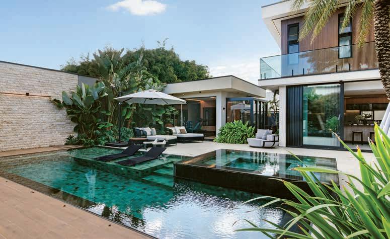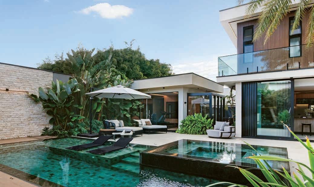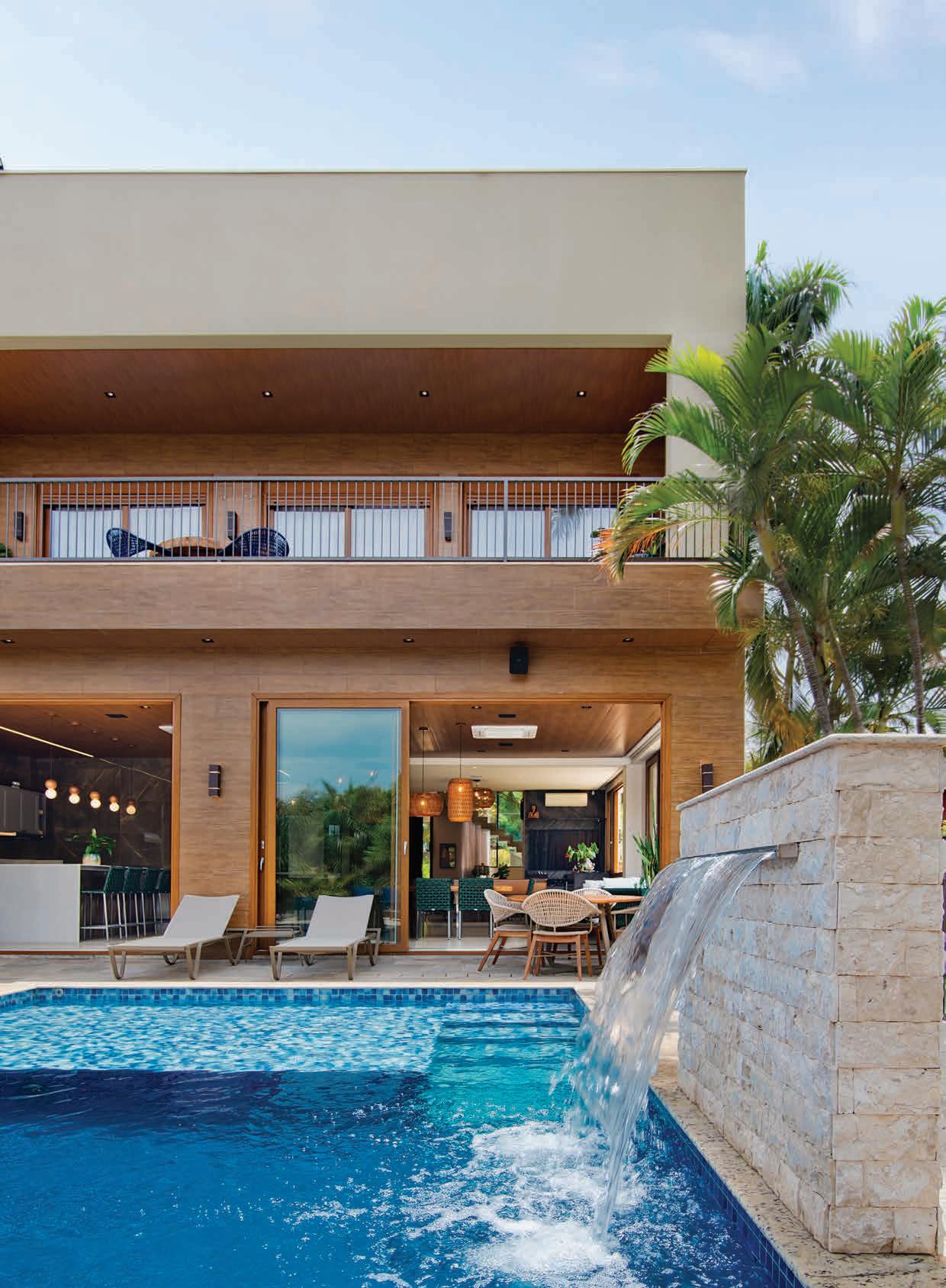 O lazer tem como protagonista a piscina revestida em pastilhas e cascata em pedras naturais. As máquinas e equipamentos são da Kisol Piscinas e Aquecedores. A iluminação é da NR Iluminação. Na foto menor, a fachada revela a harmonia entre os jardins, assinado por Joao Sabino e o mix de acabamentos, que tem pedras naturais, textura e a madeira do pergolado (Gaúcho Madeiras)