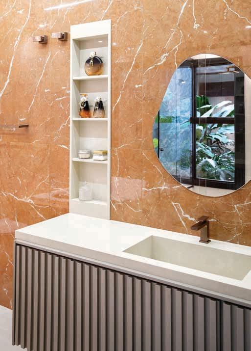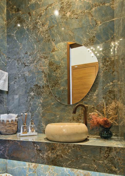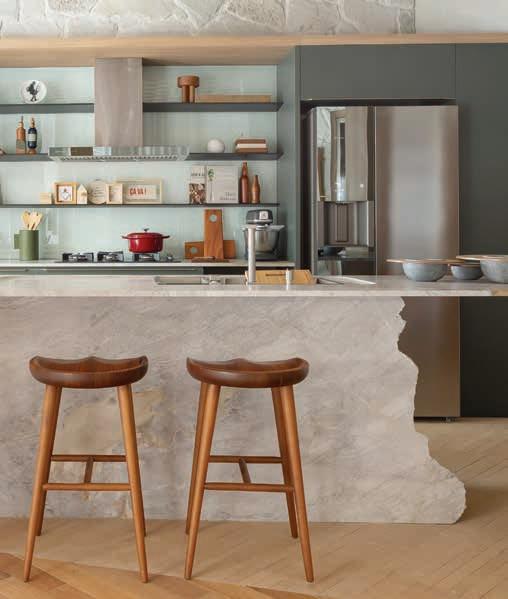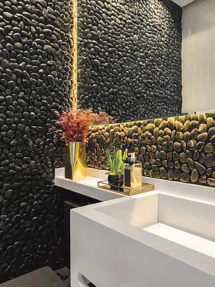 Temos diversas opções, cada uma com suas características! Neste projeto, a Moledo de Travertino foi a escolha ideal. Sua coloração mais homogênea e a textura diferenciada em relação aos moledos tradicionais agregam charme ao ambiente, criando uma atmosfera única que alia durabilidade e versatilidade.