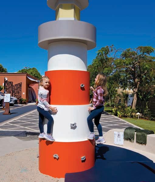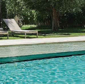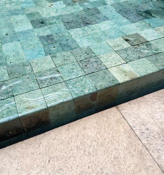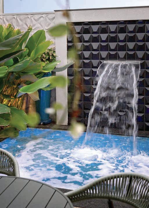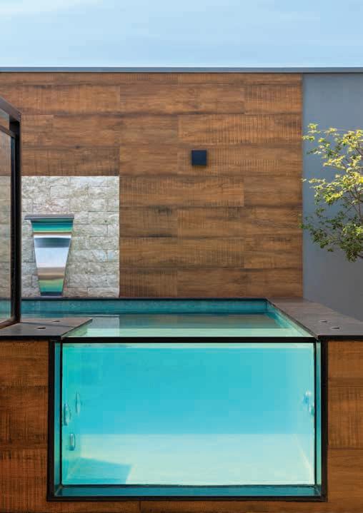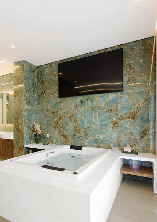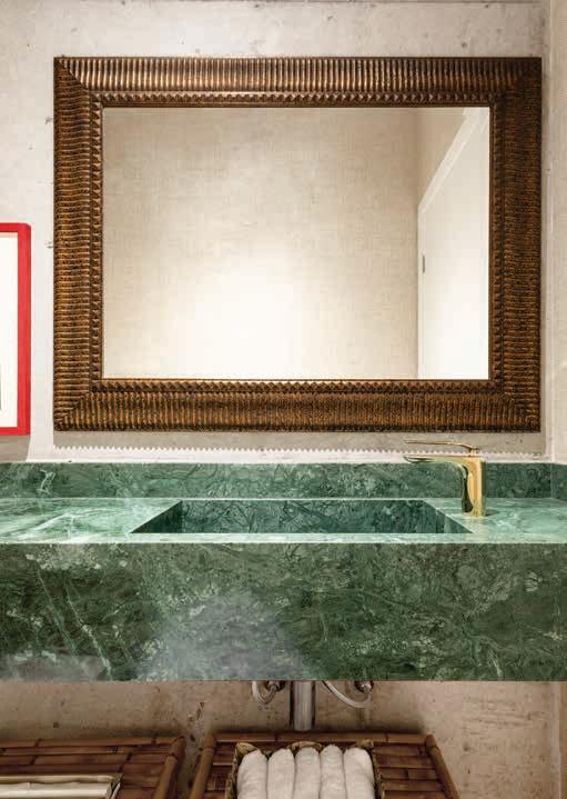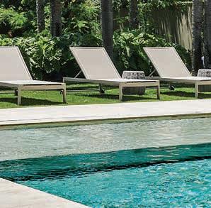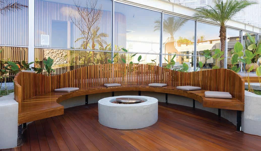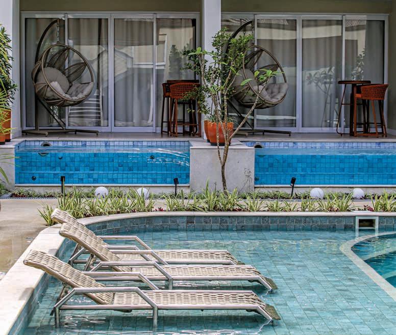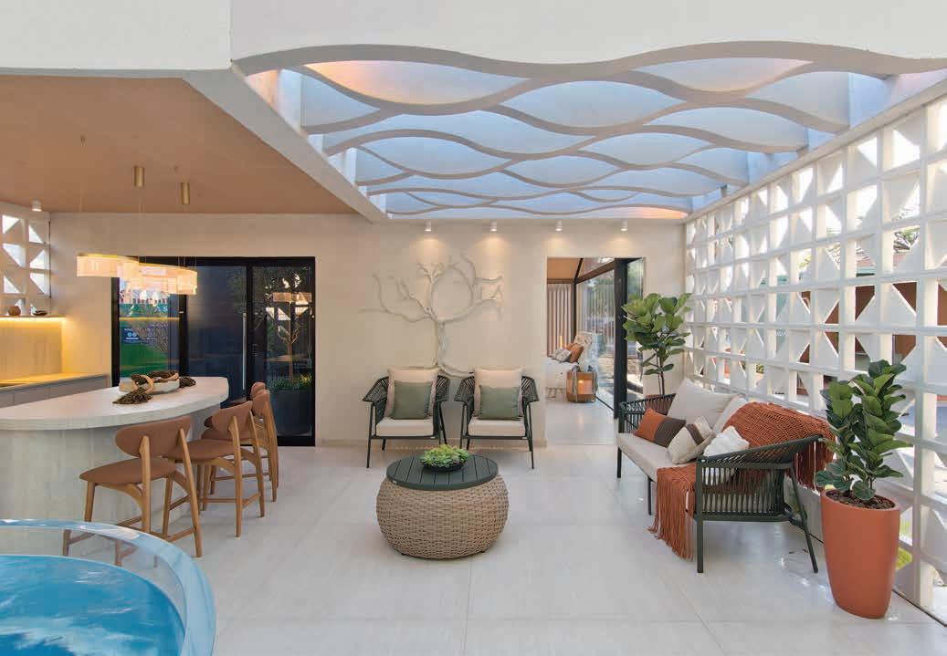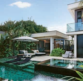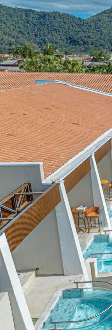 Nesta, a vista da área de lazer do hotel traduz a proposta de sofisticação contemporânea em harmonia com a natureza exuberante da região. As formas orgânicas do pergolado em estrutura metálica com brise de alumínio (Meraki Esquadrias) e das piscinas privativas revestidas com pastilha Papete da Atlas (Igui Taubaté), com guarda-corpo de vidro são complementadas pelo piso em fulget (Lá Grav) e paisagismo com espécies locais. O mobiliário solto, além de bonito, é resistente ao clima litorâneo. Para as paredes da área externa foi usado Cristal Nobre Brilhante e na área interna o Diamond Paglia, ambos são revestimentos de pedras naturais, da Dantecolor by Andrea Pimenta