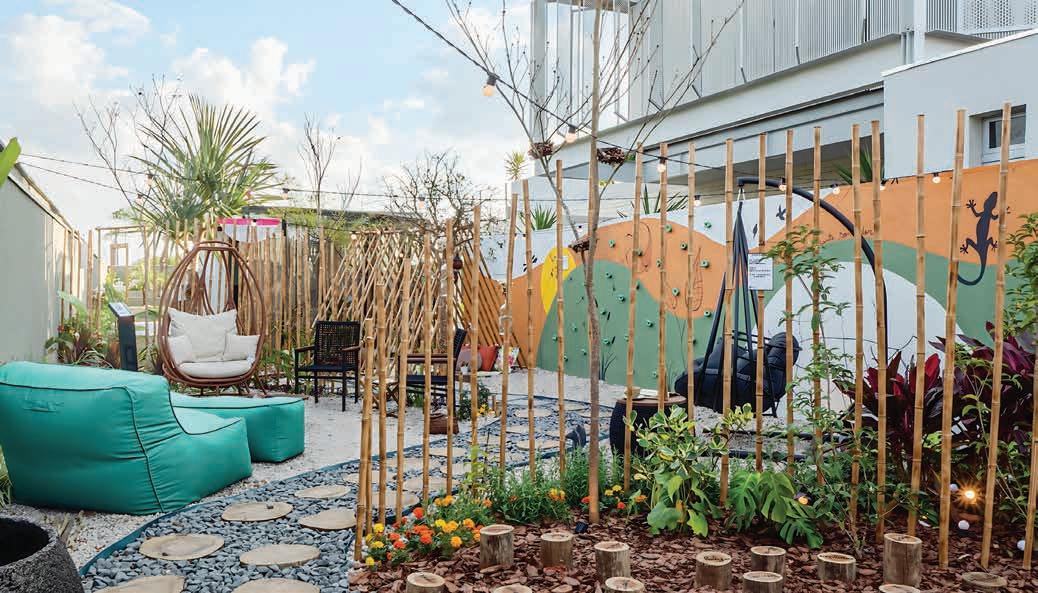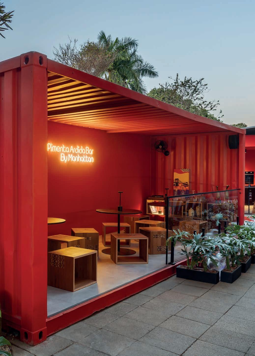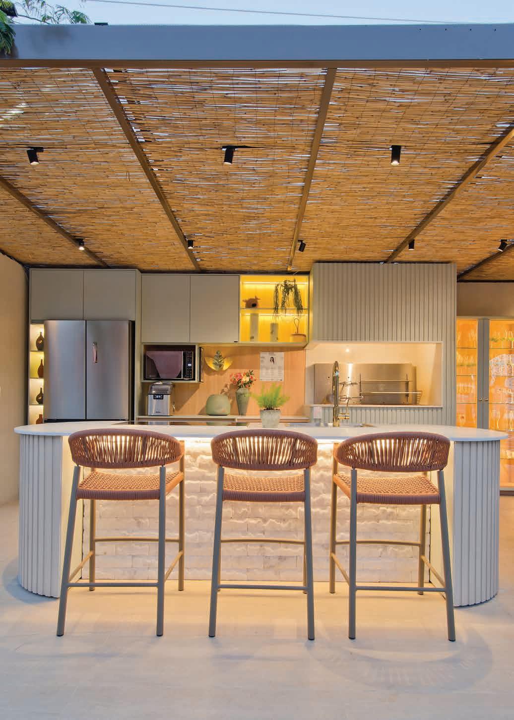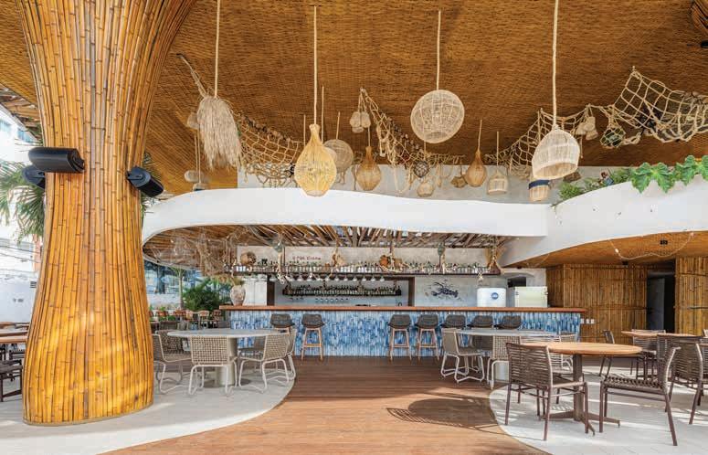 A fachada de formas orgânicas em bambu natural recebe os visitantes com um gesto arquitetônico marcante. O paisagismo tropical e os volumes sobrepostos criam fluidez e acolhimento. No interior, o projeto revela sua alma artesanal: tramas de corda, pendentes em fibras naturais e balcão revestido com azulejos pintados à mão compõem uma atmosfera tátil e afetiva. O forro curvo em bambu acompanha a fluidez dos espaços. Mobiliário sob medida em madeira cumaru e redes suspensas completam o ambiente, com arte nas paredes assinada por Gabi Rodrigues. O design de interiores foi assinado por Lara Linhares