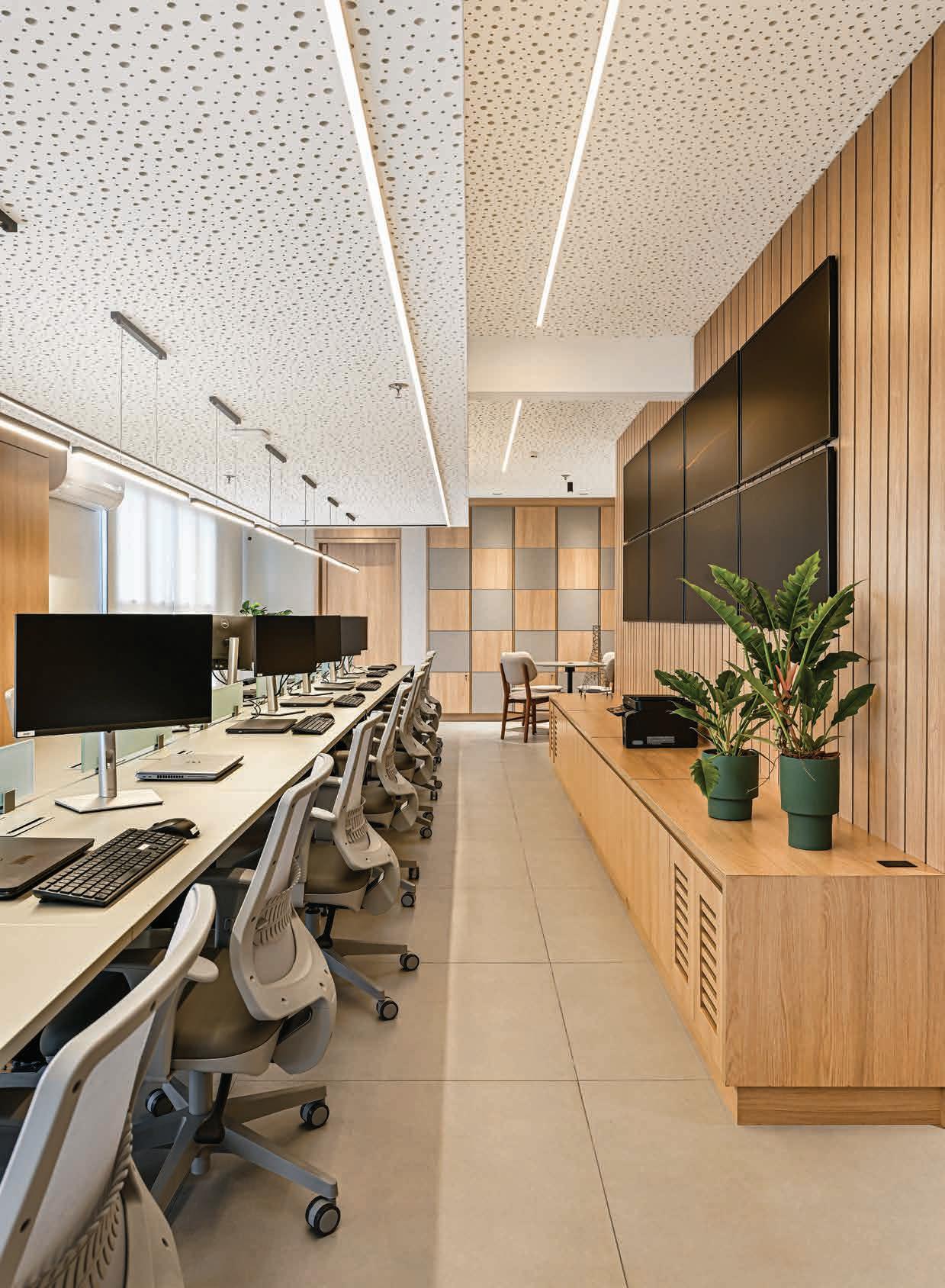 Acima, painel revestido com papel de parede (Persiana e Cia) destaca a logo da empresa modernizando a entrada do escritório. Rasgos de luz no teto e parede acentuam o ar moderno e arrojado. Na página ao lado, as paredes na área da equipe ganharam marcenaria com painéis e armários amadeirados (Sellu Marcenaria Design), que organizam o espaço e evocam conforto. O teto revestido com forro acústico foi rebaixado na linha acima das estações de trabalho com mesas e cadeiras Uni da Flexform (Valeflex Moveis Corporativos). A iluminação técnica é da Studio S Iluminação