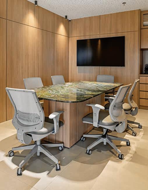 Na primeira foto, no alto, a sala da diretora ganhou uma estante em marcenaria (Sellu Marcenaria Design), persiana Romana (Persiana e Cia) e duas cadeiras para receber os clientes com conforto. Na segunda foto, o tampo de mesa em Quartzito Sombori Island conferiu sofisticação à sala de reuniões, que foi toda revestida com painéis de marcenaria, executados pela Sellu Marcenaria Design, que também assinou os móveis sob medida dos ambientes. As cadeiras giratórias Uni da Flexform são da Valeflex Móveis Corporativos. Acima, o lavabo tem bancada com cuba esculpida em quartzo branco. A iluminação técnica é do Studio S Iluminação