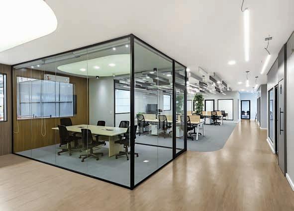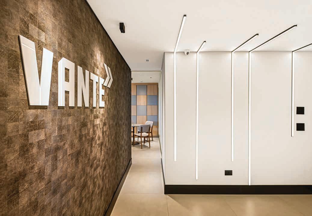 Nesta, a área de trabalho tem visual contemporâneo e industrial com a iluminação em perfilados e laje aparente. O piso vinílico amadeirado Belgotex (Pisovale) traz aconchego ao ambiente, enquanto o mobiliário corporativo, linha Twist da Alberflex (Office Vale), foi planejado para permitir a ampliação de postos. Ao fundo, a marcenaria (Madecor Móveis Sob Medida) realiza o fechamento das áreas técnicas e garante organização e uniformidade ao espaço. Na foto menor, ao lado, a recepção tem um aconchegante estar, que foi valorizado pela tela tensionada iluminada e pelo forro trabalhado em diferentes alturas e acabamentos. No mobiliário foi usada a linha Liza da Alberflex encontrada na Office Vale. As divisórias e drywall são da Pisovale