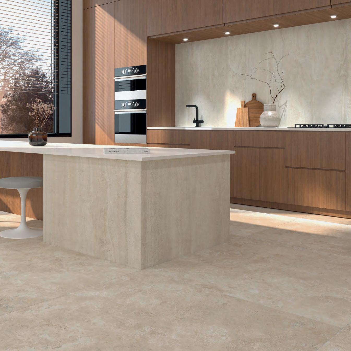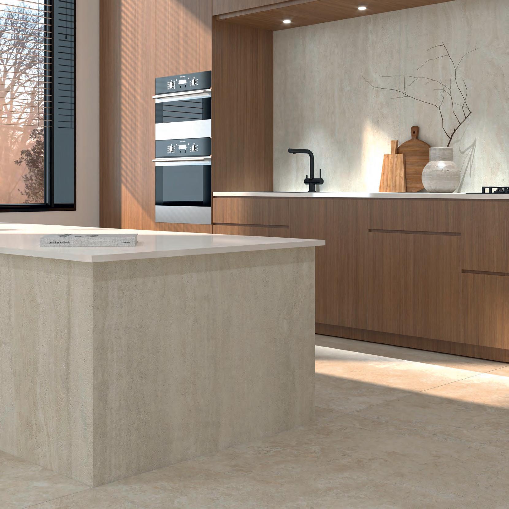 TRAVERTIN aus der Designer’s Collection überzeugt durch das großzügige Format von 260 × 120 cm und vereint zeitlose Ästhetik mit Funktionalität. Das innovative 3D-Design vermittelt den Eindruck einer perfekten Travertin-Optik, während die Oberfläche eine vollkommen glatte Haptik aufweist, gepaart mit den überragenden Eigenschaften von Keramik hinsichtlich ihrer Pflegeleichtigkeit.