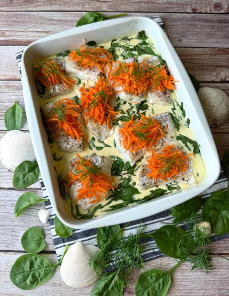 Torsk i form med spinat 12 / Stekt makrell med lun potetsalat 15 / Lettsaltet steinbit 16 / Seibiff med løk i fløtesaus 19 / Potet- og fiskepinner 22 Bakt søtpotet med lettsaltet torsk 25 / Ovnsbakt torsk med tilbehør 26 / Torsk i tomatform 29 Luksus fiskegrateng 30 / Fritert torsk med tilbehør 33 / Plukkfiskkaker 34 / Lakseburger 37 Asiatisk laks 41 / Laks i form 42