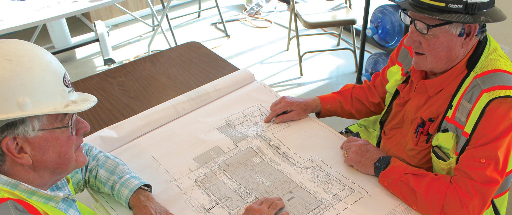 Nick Guho and Superintendent Marvin Bergloff discuss the plans for Interfaith Sanctuary’s construction.