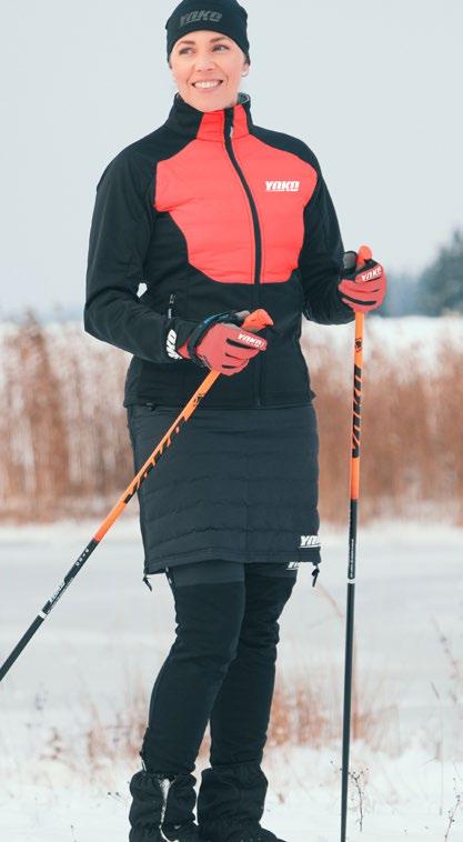 54 YOKO TRE JACKET LADIES XC ski jacket for active and leisure skiers. • Front and sleeves of jacket windproof and breathable D50 soft shell fabric • Back of jacket fourway stretch YOKOstretch fabric • Inner collar with comfortable fleece fabric • Side pockets with zipper • Hem adjustment with rubber strings • Sizes: XS–XL SKI CLOTHING LADIES Red 42-234205 Black 42-234206