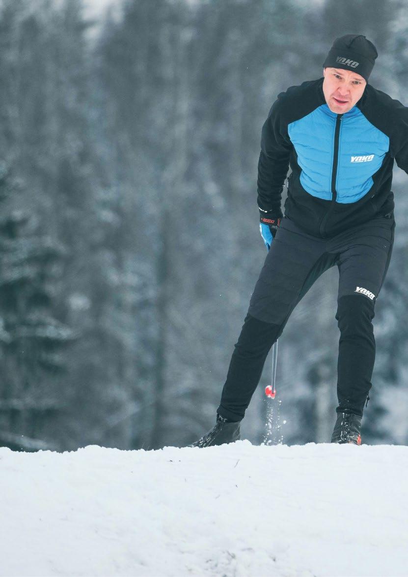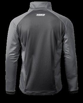 44 YOKO TWO JACKET MEN XC ski jacket for active skiers. • Front and sleeves of the jacket windproof and breathable Y-Shell soft shell fabric • Back of jacket fourway stretch YOKOstretch fabric • Front pockets with zippers • Inner collar with comfortable Y-Stretch fabric • Sleeve cuffs with comfortable, elastic flex inserts • Hem adjustment with rubber strings • Reflective prints in front • Sizes: XS–XXL 40-234003 Grey 40-234004 SKI CLOTHING MEN