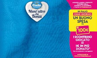 CASA MODENA GranTerre Gran Crù prosciutto crudo dolce g 90 al kg € 27,67 2,49 AIA AeQuilibrium petto di pollo arrosto cotto al forno g 130 al kg € 13,77 1,79 BERETTA Fresca Salumeria prosciutto cotto di alta qualità g 120 al kg € 18,25 2,19 PHILADELPHIA original g 150 al kg € 9,00 1,35 VALLELATA Fior di Latte 8 Bocconcini g 200 al kg € 10,50 2,10 BIRAGHI Gran Biraghi formaggio stagionato g 100 al kg € 13,00 1,30 AIA Wudy classico pz 2 x g 250 al kg € 3,58 1,79 GRANAROLO Benessere stracchino ad alto contenuto di proteine g 160 al kg € 10,63 1,70 KRAFT fettine classiche g 175 al kg € 7,94 1,39 SOTTILETTE light g 200 al kg € 6,95 1,39 * Fattorie Osella si impegna a donare subito 10.000€ a Fondazione Francesca Rava N.P.H. Italia Onlus e con ogni partecipazione al concorso la donazione aggiuntiva può arrivare no a un massimo di 10.000€, per una donazione totale da parte di Fattorie Osella di massimo 20.000€. Concorso valido dal 17/04/2023 al 30/06/2023, con eventuale estrazione a recupero entro il 31/07/2023. Montepremi complessivo di 7.500€, IVA esclusa ove prevista. Elenco prodotti in promozione, limitazioni, modalità di partecipazione e regolamento su www.fattorieosella. it. Conserva lo scontrino o il documento d’acquisto. BERETTA pancetta a cubetti dolce/ a umicata pz 2 x g 90 al kg € 12,72 2,29 WUBER N38 wurstel brat, servelade, krainer g 240 al kg € 12,04 2,89 PER TE mozzarella L'Italiana pz 3x g 125 al kg € 6,61 2,48 SELEX Ricotta g 250 al kg € 3,56 0,89