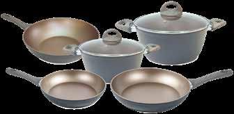 in alluminio forgiato - rivestimento esterno grigio - rivestimento interno antiaderente champagne - spessore differenziato 3,8 mm - impugnatura termoresistente soft touch effetto legno - adatta a tutti i piani di cottura compresa induzionecomposizione: padella diam. cm. 22 + cm. 26 + casseruola diam. cm. 20 + cm. 24 + salta pasta diam. cm. 28 + coperchio vetro temperato diam. cm. 20 + cm. 24 DA € 39,90