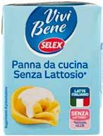 15 ALIMENTI CONFEZIONATI MOLINO VIGEVANO FARINA PER PIZZA TIPO 1500 g al kg € 2,98 € 1,49 GRAN GALLO RISO CARNAROLI 1 kg € 2,89 LUCIANA MOSCONI PASTA ALL'UOVO VARI FORMATI 500 g al kg € 4,98 € 2,49 TONNO MAREBLU OLIO OLIVA 8x 60 g al kg € 10,19 € 4,89 FILETTI TONNO VASO VETRO OLIO OLIVA gr.200 al kg € 24,95 € 4,99 CALVÈ CLASSICA 225 ml al l € 5,29 € 1,19 ACCADÌ BENESSERE PANNA DA CUCINA SENZA LATTOSIO* 3x 100 ml al l € 5,13 € 1,54 PARMALAT CHEF PANNA DA CUCINA 3x 125 ml al l € 5,81 € 2,18 DEL VERDE PASTA DI SEMOLA FORMATI ASSORTITI 500 g al kg € 1,50 € 0,75 PASTIFICIO LIGUORI PASTA DI GRAGNANO I.G.P. GRANO 100% ITALIANO FORMATI ASSORTITI 500 g al kg € 1,98 € 0,99 GRAN PAVESI SFOGLIE 150 g al kg € 9,87 / 8,22 € 1,48 SELEX VIVI BENE PANNA DA CUCINA UHT SENZA LATTOSIO 200 ml al l € 3,75 € 0,75 SELEX PANNA DA CUCINA UHT 200 ml al l € 3,45 € 0,69 SELEX BESCIAMELLA PRONTA PER CUCINARE A LUNGA CONSERVAZIONE 500 ml al l € 2,38 € 1,19 BRODO DI CARNE/ VERDURE. SENZA € 0,69 DA € 1,00 -31 % PARMALAT CHEF PANNA AI FUNGHI/ AL SALMONE 2x 125 ml al l € 7,96 € 1,99 DA € 2,55 -21 %