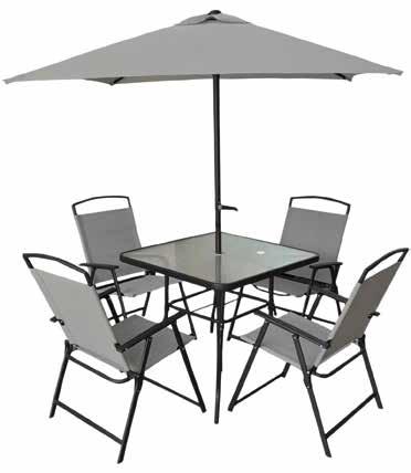 tessuto ombrellone poliestere gr. 160/m2 grigio chiaro, struttura tavolo, sedie e ombrellone in acciaio verniciato a polvere grigio antracite, tessuto sedie textilene 2x1 grigio chiaro, piano d’appoggio in vetro temperato semitrasparente spessore 5 mm - tavolo cm 86x86x72 h, sedia cm 72x56x91,5 h, ombrellone cm 150x150, 4 stecche, palo Ø mm 32
