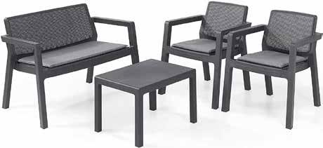 Set 4 pezzi salottino Emily in resina colore antracite con cuscini - dimensioni: sedia (x2): cm. 68x64x75 - divano cm. 111x68x75 - tavolo cm. 65x47x42