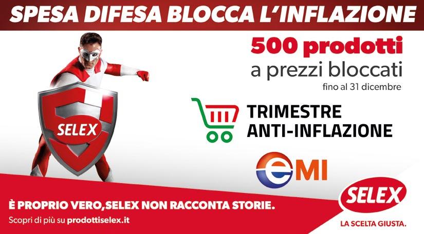 Seguici su www.emisupermercati.it 3 al 25 ottobre 2023 0,99 DE CECCO Pasta di Semola Assortita g 500 (al kg € 1,98) 0,99 CIRIO i Classici Pelati dal 1856 g 400 (al kg € 2,47 ) 0,99 LA TORRENTE Passata di Pomodori Pomolà g 700 (al kg € 1,41) 0,99 SELEX Creme/Minestre in busta gusti assortiti 0,99 STAR il mio Dado assortito 10 Dadi g 100 (al kg € 9,90) 0,99 SELEX giardiniera con aceto di vino g 300 - sgocc. g 180 (al kg € 3,30) 0,99 SILVIA sughi arrabbiata, basilico g 400 (al kg € 2,47 ) 0,99 SACLÀ OlivOlì olive nere snocciolate senza liquido, toste g 75/100 (al kg € 13,20) 0,99 NATURA CHIAMA SELEX Ceci Lessati Italiani Biologici g 300 (al kg € 3,30) 0,99 SELEX Crackers Classici/ Rosmarino g 300 (al kg € 3,30) 0,99 MORATO Spuntinelle Le Originali Mini g 175 (al kg € 5,66)