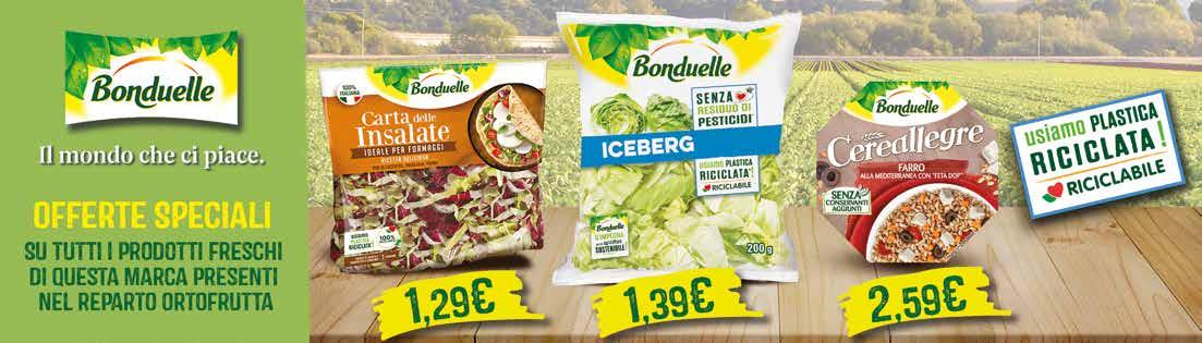 ORTOFRUTTA 9 DA € 1,28 -22 % CIPOLLE ROSSE 800 g al kg € 1,24 € 0,99 DA € 2,49 -48 % EUROVERDE VALERIANA 200 g al kg € 6,45 € 1,29 DA € 1,49 -33 % MISTICANZA BIO 125 g al kg € 7,92 € 0,99 DA € 2,49 -20 % CREMA PISELLI E ZUCCHINE 620 g al kg € 3,21 € 1,99 OLIVE VERDI CERIGNOLA 225 g al kg € 8,40 € 1,89 CECI SELECT VETRO 100% ITALIA 360 g al kg € 2,75 € 0,99 CETRIOLI KNAX HENGSTENBERG 330 g al kg € 7,85 € 2,59 MALETTI REGNANI ACETO BALSAMICO DI MODENA I.G.P. 500 ml al l € 2,18 € 1,09 MUTTI SALSA PRONTA CLASSICA / DECISA 300 g al kg € 4,63 € 1,39 INSALATA RICCIA al kg € 1,99 DA € 2,98 -33 % CAROTE SFUSE al kg € 1,29 DA € 1,68 -23 %