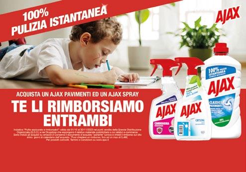 Seguici su www.emisupermercati.it 23 DETERGENZA CASA al 25 ottobre 2023 3,19 NAPISAN Detersivo lavatrice igienizzante classico,color 23 lavaggi - litri 1,15 (al litro € 2,13) 3,79 FELCE AZZURRA detersivo lavatrice liquido Classico 32 lavaggi litri 1,595 (al litro € 2,38) 2,99 DEOX Detersivo lavatrice classico 24 lavaggi (al litro € 2,49) 2,49 SPUMA DI SCIAMPAGNA ammorbidente concentrato assortito 65 lavaggi - litri 1,3 (al litro € 1,92) 2,25 FELCE AZZURRA ammorbidente concentrato Classico litri 1,025 - 41 lavaggi (al litro € 0,56) 1,99 FABULOSO Detersivo Pavimenti Freschezza Lavanda ml 950 (al litro € 2,09) 1,89 AJAX detersivo spray Crystal Vetri 100% Anti-Alone ml 750 (al litro € 2,52) 2,45 AJAX detersivo Spray con candeggina igienizzante ml 675 (al litro € 3,63) 3,99 FINISH Pastiglie per Lavastoviglie assortite pz 14/16/18/22 AJAX Detersivo Pavimenti assortito ml 950 (al litro € 2,61) 2,48 2,39 OMINO BIANCO additivo igienizzante in polvere/ liquido/ caps 1,39 DEOX ammorbidente concentrato lavatrice Fiori di Primavera 33 lavaggi - ml 660 (al litro € 2,11) 2,29 CHANTECLAIR Sgrassatore Spray assortiti ml 625 (al litro € 3,66) 2,35 MASTRO LINDO Detergente Limone/ Bagno ml 930 (al litro € 2,53)