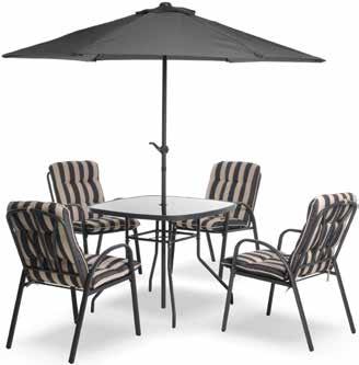 SET TAVOLO + 4 sedie con cuscino + ombrellone. tavolo quadrato 90 x 90 x h 74 piano d'appoggio in vetro temperato spessore mm 5 nero, sedia cm 71 x 54 x h 88.5, ombrellone diam. cm. 200, apertura/chiusura con manovella