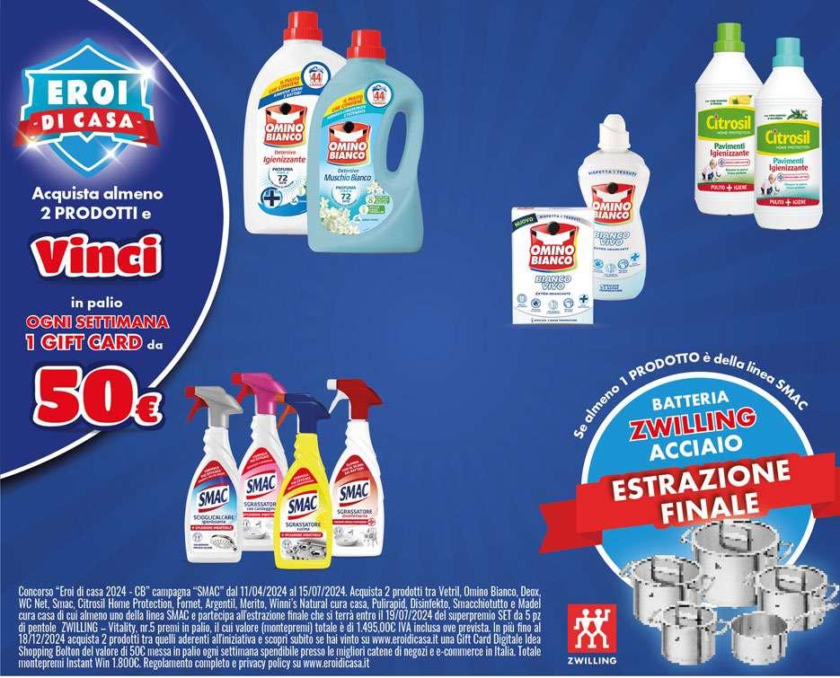 € 4,30 €2,88 33% REGINA Carta Igienica Cartacamomilla 4 rotoli € 13,45 €8,74 35% DASH PODS Detersivo Lavatrice In Capsule 31 Lavaggi LINES È Assorbenti Femminili Pacco Singolo Assortiti €3,19 PERLANA Detersivo Assortito 28 lavaggi - litri 1,40 € 5,99 €4,19 30% SPUMA DI SCIAMPAGNA Ammorbidente Concentrato litri 1,30 € 3,29 € 2,46 25% ACE GENTILE Candeggina litri 2,3 €3,19 FAIRY Caps lavastoviglie 17/14/12 pz € 5,90 €3,54 40% AUTAN TROPICAL Insetto Repellente Vapo/ Spray ml 100 € 7,90 €4,74 40% SELEX CASA BELLA Tovaglioli Colorati Assortiti 2 veli - cm 33x33 50 pz € 1,69 €1,01 40% SELEX NATURA CHIAMA Bicchieri Caffè Biodegradabili e Compostabili Ecologici 80 cc 50 pz € 1,99 €1,39 30%