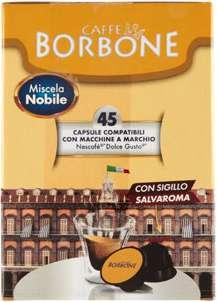 Compatibili Dolce Gusto 45 pz - g 315 €9,90 al kg € 31,43 SELEX Cialde Caffè Classico 18 pz - g 125 €1,99 al kg € 15,92 NESCAFÉ DOLCE GUSTO Capsule Caffè Assortite 30 pz - g 210/195/189 €7,59 al kg € 36,14 KIMBO Capsule Caffè Assortite Compatibili Nespresso 30 pz - g 165 €6,39 al kg € 38,73 KIMBO UNO Capsule Caffè Assortite 16 pz x g 7 €3,89 al kg € 34,73 LAVAZZA Cialde Caffè Crema e Gusto Classico 50 pz - g 350 €6,29 al kg € 17,97 RISTORA Capsule Compatibili Nespresso 10 pz x g 8/7,5/2 € 2,19 al kg € 27,38 ORZOBAR 3 GOBBETTI Cialde Caffè 30 pz - g 180 € 2,69 al kg € 14,94 GOLD CHOICE Ginseng Coffee Solubile 20 buste - g 20 €6,99 al kg € 17,48