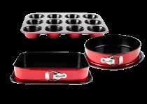 SET 3 PZ COTTURA DOLCI ANTIADERENTE, materiale in carbon steel colore rosso composto da stampo 12 muffin cm 35x26x5x5x3, tortiera 1 fondo apribile :cm 26 x 6,8, tortiera rettangolare apribile: cm 39x27x7,5