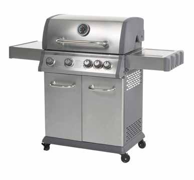 BARBECUE A GAS TREND con fuoco laterale con forno, maniglia, termometro, ripiani laterali con ganci appendi utensili e piezo. mobiletto in acciaio verniciato dotato di rotelle con freno, 4 fuochi da 3.0 kw + 1 fuoco laterale da 2.5 kw. dimensioni cm 133 x 57 x 112. griglia di cottura cm 70 x 42, scaldavivande cm. 70x12