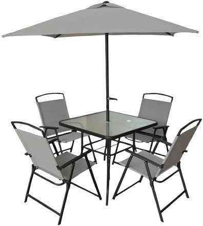 SET TAVOLO + 4 SEDIE PIEGHEVOLI con braccioli + ombrellone con manovella. tessuto ombrellone poliestere gr. 160/m2 grigio chiaro, struttura tavolo, sedie e ombrellone in acciaio verniciato grigio antracite, tessuto sedie textilene grigio chiaro, piano d'appoggio in vetro temperato semitrasparente spessore 5 mm. tavolo cm 86 x 86 x h 72, sedia cm 72 x 56 x h 91.5, ombrellone cm 150 x 150