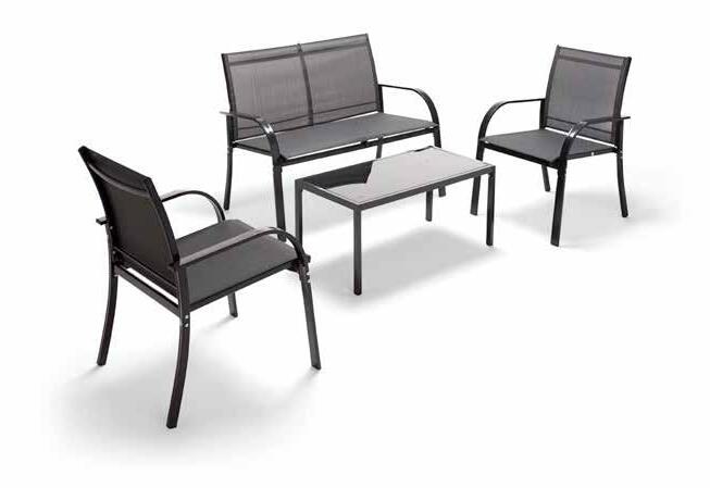 struttura in acciaio verniciato - poltrone in texilene - tavolino con piano in vetro - colore grigio chiaro: 2 poltrone dim. cm. 66,5x58x82 h. + sofa dim. cm. 106x66,5x82 h. + tavolino dim. cm. 85x45x38 h.