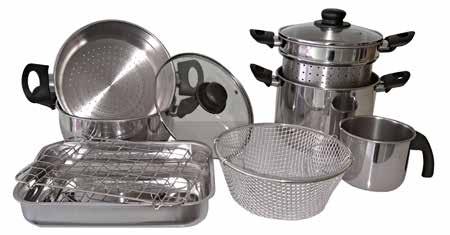 BATTERIA PENTOLE SMART 10 PEZZI in acciaio aisi 430, manici in bakelite, adatta anche alla cottura ad induzione - cosi' composta: bollipasta cm.20 con cestello e coperchio in vetro, vaporiera cm.24 con cestello e coperchio in vetro, friggitrice cm.24, teglia rettangolare cm.30x22 + griglia, bollilatte 1 litro