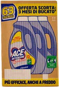 ACE DETERSIVO IGIENIZZANTE CLASSICO/COLORATI 3 x 21 Lavaggi € 6,45 PRIL EXCELLENCE DUO GEL SCIOGLI GRASSO 540 ml € 3,59 LENOR ORO & FIORI 86 lavaggi € 4,99 KH-7 ANTICALCARE 750 ml € 2,00 SMAC EXPRESS SGRASSATORE/ IGIENIZZANTE/ SCIOGLICALCARE 650 ml € 1,50 KH-7 CUCINA UNIVERSALE 750 ml €