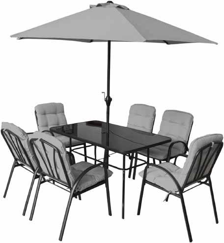 SET VIAREGGIO: tavolo + 6 sedie con cuscino + ombrellone. tavolo rettangolare 140 x 85 x h 70 - piano d'appoggio in vetro temperato spessore mm 5 nero, struttura tavolo, sedie e ombrellone in acciaio verniciato colore nero, sedia cm 71 x 54 x h 88.5, tessuto cuscini poliestere grigio, spessore cm 5. ombrellone cm. 200 x 300 apertura/chiusura con manovella