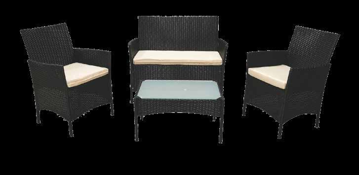 struttura in metallo - rivestimento in polyrattan nero con intreccio tipo wicker - 3 cuscini imbottiti colore avorio - rivestimento in poliestere sfoderabile con zip - il set si compone di: 2 poltroncine: l.