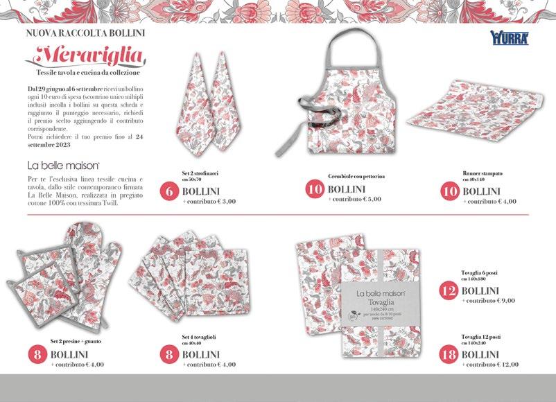 IL MEGLIO DELLA CONVENIENZA 14 OFFERTE VALIDE SOLO PER CONSUMI FAMILIARI DAL 29 GIUGNO AL 12 LUGLIO 2023 IL ROCCOLO vino rosato frizzante cl 75 al litro € 2,65 €1,99 IL ROCCOLO Chardonnay frizzante cl 75 al litro € 2,65 €1,99 CA' FORNARA Pinot Bianco Veneto Igt cl 75 al litro € 3,05 € 2,29 CORTE REGALE primitivo Puglia Igt cl 75 al litro € 4,65 €3,49 IL POGGIO DEI VIGNETI merlot Veneto Igt cl 75 al litro € 2,52 €1,89 TOSO prosecco spumante Doc cl 75 al litro € 5,72 €4,29 SAN CRISPINO vino da tavola brik rosso, bianco pz 3 x cl 25 al litro € 2,25 €1,69 AQUAFRESH dentifricio tripla protezione ml 125 €1,29 NIVEA Crema Corpo assortita ml 500 al litro € 9,38 €4,69 LINES Seta Ultra Assorbenti Assortiti pz 60/66/84 €8,90 TOP5 candeggina spray litri 1 €1,19 TOP GREEN percarbonato g 300 al kg € 8,97 V C IN O A L L A N A T U R A € 2,69 INSETTICIDA spazi aperti mosche e zanzare ml 500 €3,39 GREEN&CHIC Deodoranti Vapo/ ministick assortiti ml 100/60 € 2,19 FIORELLI cocktail bellini cl 75 al litro € 4,39 €3,29 125 ML TOP GREEN acido citrico g 300 al kg € 11,30 €3,39 V I C IN O A L L A N A T U R A TOP 5 sgrassatore limone spray litri 1 €1,49