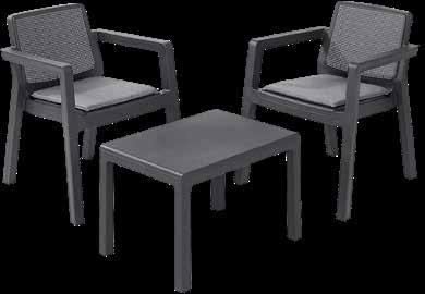 SET EMILY in resina alta resistenza colore antracite composto da: 2 poltrone dim. cm. 68x64x75 h. con cuscini + tavolino dim. cm. 65x47x43 h. € 69,90