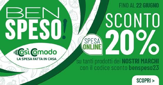 MEDUSA sugo fresco alle vongole sgusciate, tonno e olive g 150 al kg € 16,00 2,40 MAMMA EMMA gnocchi ripieni assortiti g 400 al kg € 4,98 1,99 CASA MODENA LiberaMente prosciutto cotto alta qualità magro g 110 al kg € 14,45 1,59 WÜBER wurstel puro suino g 100 al kg € 7,90 0,79 VALLELATA mozzarella Fior di Latte pz 3 x g 125 al kg € 7,97 2,99 ALPRO Absolutely almond, coconut g 120 al kg € 9,08 1,09 PHILADELPHIA original g 150 al kg € 8,60 1,29 ITALPIZZA la Numero Uno surgelata g 435 al kg € 6,18 2,69 GOLOSI & SFIZIOSI carciofini tagliati g 290 al kg € 7,41 2,15 VALFRUTTA Cotti a Vapore fagioli borlotti, ceci Italiani 3 pz x g 150 al kg € 4,20 1,89 FARCHIONI Il Casolare olio extra vergine di oliva classico litri 1 6,98 PONTI Peperlizia Insalata per pasta, riso classica/ light g 350 - sgocc g 210 al kg € 5,40 1,89 BARILLA pesto basilico e pistacchio, basilico e limone g 190 al kg € 9,95 1,89 BURN energy drink original cl 25 al litro € 3,56 0,89 SANPELLEGRINO bibite assortite litri 1,2 al litro € 0,96 1,15 SAN BENEDETTO acqua oligominerale naturale litri 1 0,24 NOVITÀ