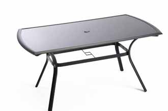 TAVOLO ALCOR dim. cm. 150x90x72 altezza - gambe in acciaio verniciato - supporto piano di appoggio in alluminio con top in vetro temperato 5 mm. nero con foro diam. mm.43 per ombrellone