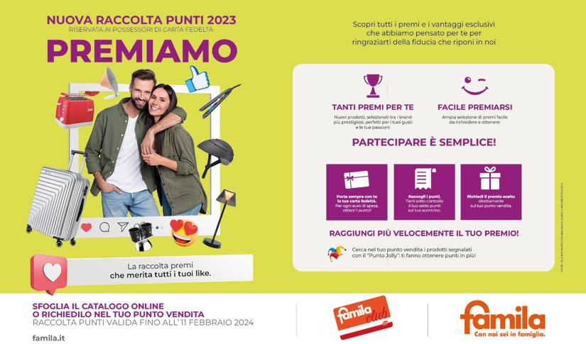 PARTNER DI FAMILA ALCUNI ARTICOLI POTREBBERO NON ESSERE PRESENTI NELL’ASSORTIMENTO ONLINE DELLA PROPRIA ZONA. ACQUISTI LIMITATI AL CONSUMO FAMILIARE PREZZI ED ARTICOLI VALIDI FINO AD ESAURIMENTO SCORTE. PROMOZIONE VALIDA SOLO SUI PRODOTTO SEGNALATI NEL PUNTO VENDITA. LE FOTO DEI PRODOTTI POSSONO SUBIRE VARIAZIONI NEL CASO DI EVENTUALI ERRORI TIPOGRAFICI, RIBASSI O MODIFICHE ALLE LEGGI FISCALI. RISPETTA L’AMBIENTE, NON GETTARE PER TERRA QUESTO VOLANTINO. GRAZIE