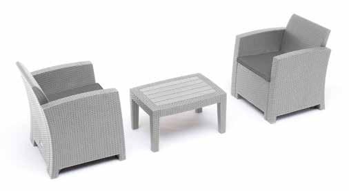 Set Iseo set composto da 2 poltrone + tavolino + cuscini, struttura in polipropilene (pp) stampato effetto rattan colore grigio chiaro, tessuto cuscini poliestere g 180/mq cm 52x30 spessore cm 3 - tavolino cm 70x50.5 - poltrona cm 68x65.6x76 altezza
